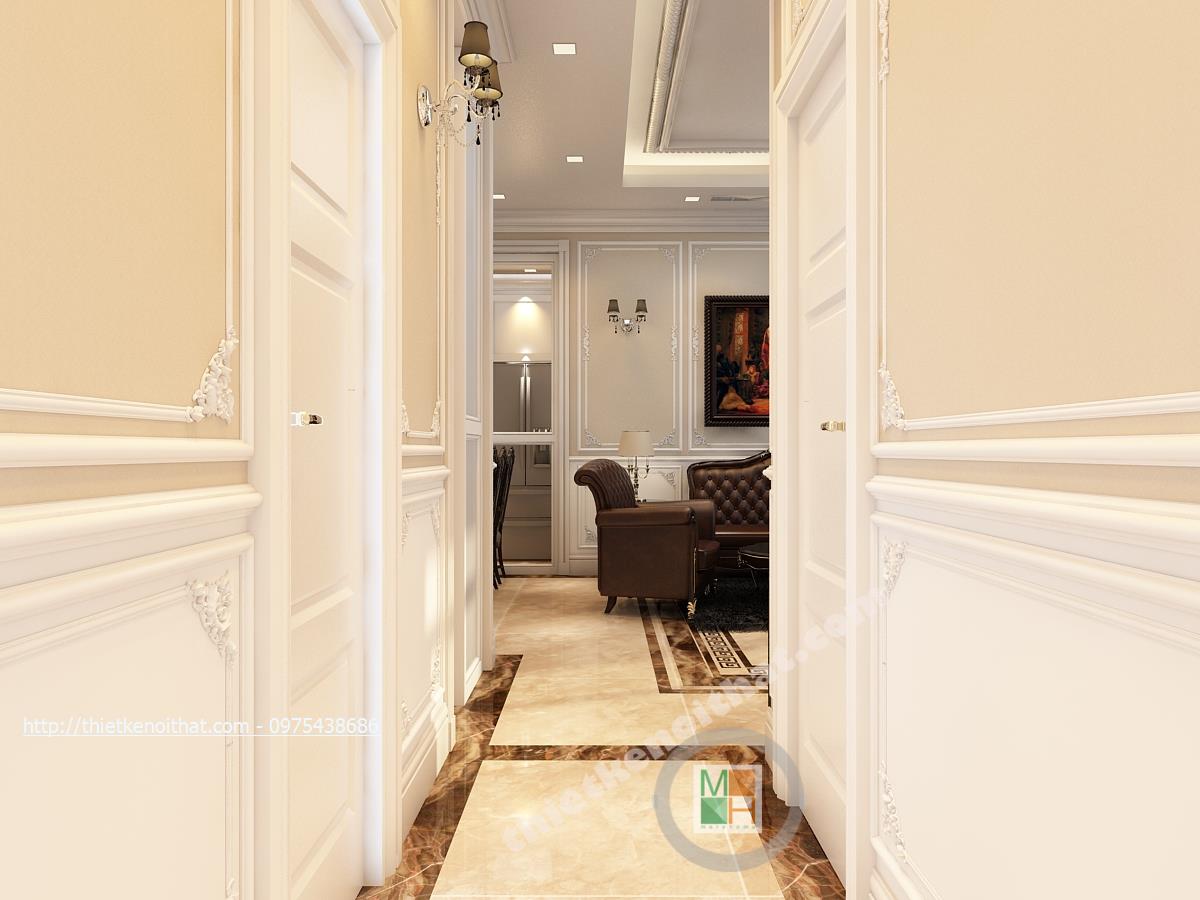 Thiết kế nội thất tân cổ điển là một trong những thiết kế đòi hỏi sự tỉ mỉ và chăm chút của chính gia chủ và kiến trúc sư. Thông thường phong cách thiết kế nội thất tân cổ điển được ứng dụng bởi đây là các thiết kế khá cầu kỳ, các đường cong và trang trí tỉ mỉ đôi khi sẽ gây lại cảm giác khá rắc rối và rườm rà ở các không gian thiết kế hẹp như căn hộ chung cư nhỏ. Mặc dù vậy, thiết kế nội thất đã cho thấy không có gì là khó khăn khi kiến trúc sư đã khéo léo tìm giải pháp cân bằng giữa đường nét và màu sắc từ đó mang đến một không gian thư giãn nhẹ nhàng với phong cách châu Âu cổ điển.