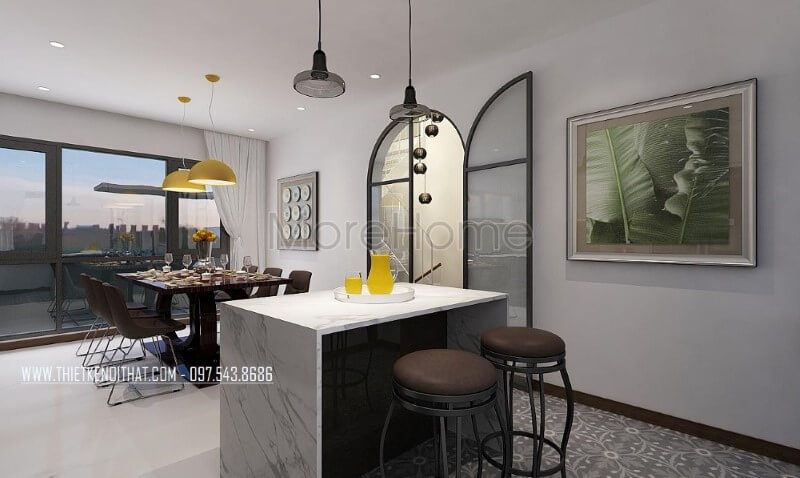 Bàn ghế ăn hiện đại đẹp sang trọng với sự kết nối đồng điệu giữa chiếc bàn gỗ chân sắt sang trọng cùng bộ 8 ghế sẫm màu.