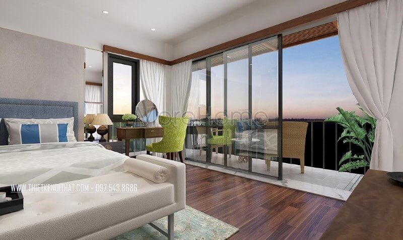 Phòng ngủ biệt thự hiện đại, thông thoáng và sang trọng bởi ý tưởng trang trí mở từ hệ cửa kính cường lực lớn giúp bạn có thể tận hưởng cảm giác trong lành, ngắm nhìn vẻ đẹp tuyệt vời từ thiên nhiên ngay tại giường ngủ của mình.