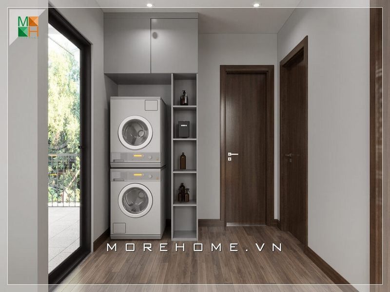 Tủ kệ đựng đồ trong phòng giặt của biệt thự tiện lợi ngăn nắp giúp người nội trợ thêm thuận tiện dễ dàng hơn.