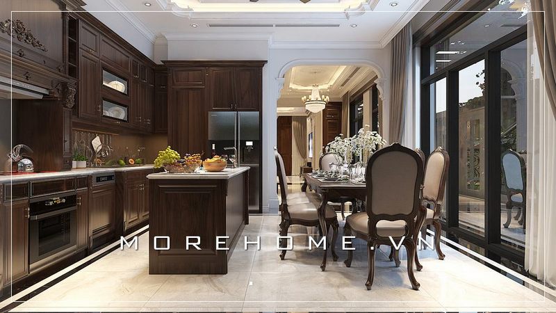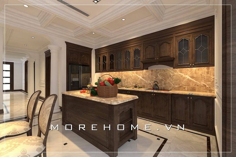 Bàn đảo bếp gỗ tự nhiên, mặt bàn ốp đá màu đen cùng thiết kế các chân trụ tân cổ điển ấn tượng, sang trọng cho không gian phòng bế[