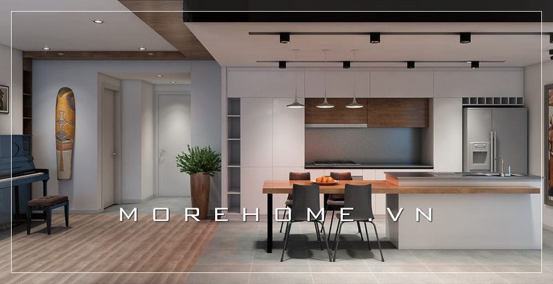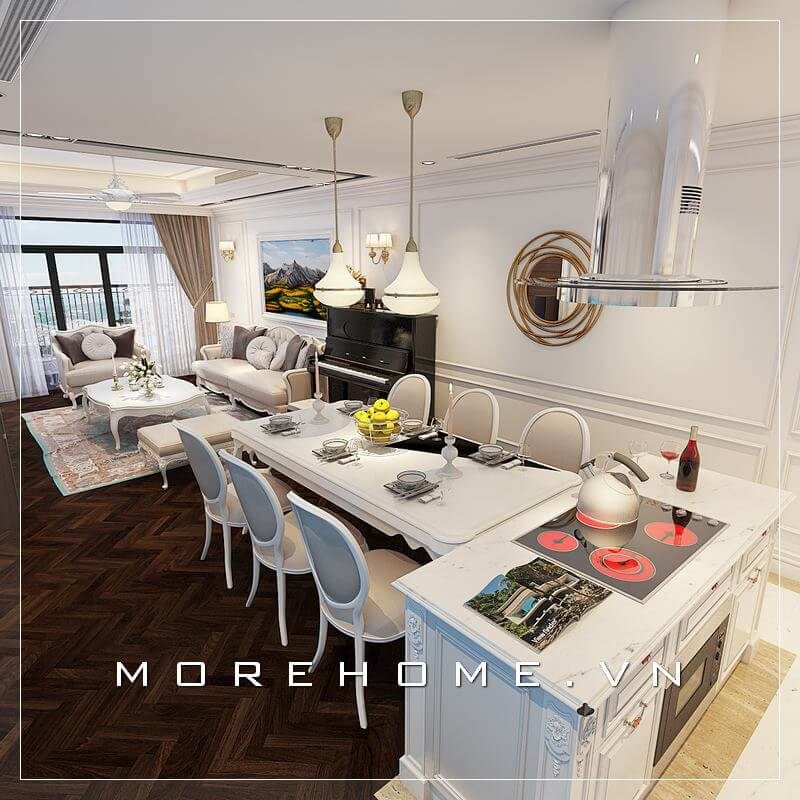 Mẫu bàn đảo bếp gỗ tự nhiên cao cấp, đá ốp mặt bàn cao cấp được thiết kế tạo vách ngăn giữa không gian sinh hoạt của các phòng