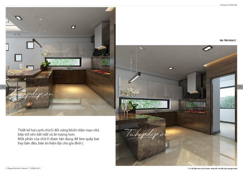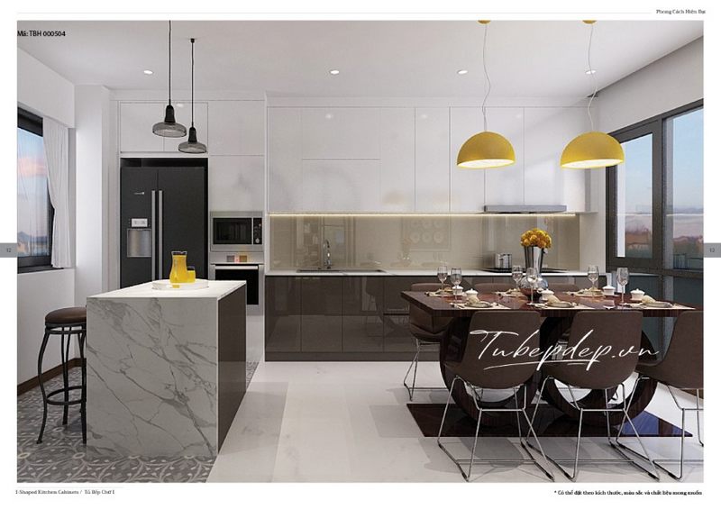 Bàn đảo bếp hiện đại, mặt bàn ốp đá cao cấp mang đến sự sạch sẽ và tiện nghi