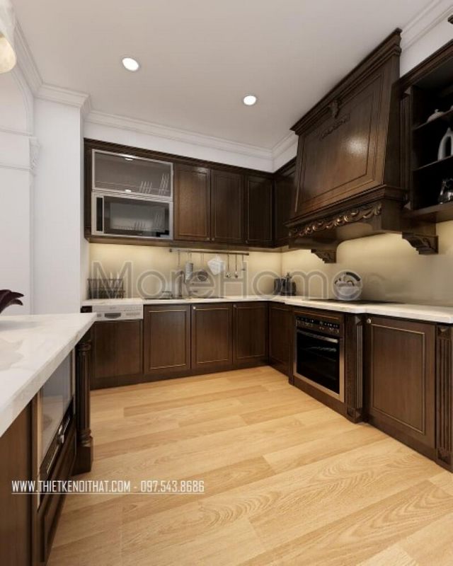 Thiết kế nội thất phòng bếp theo phong cách tân cổ điển dành cho căn hộ chung cư.