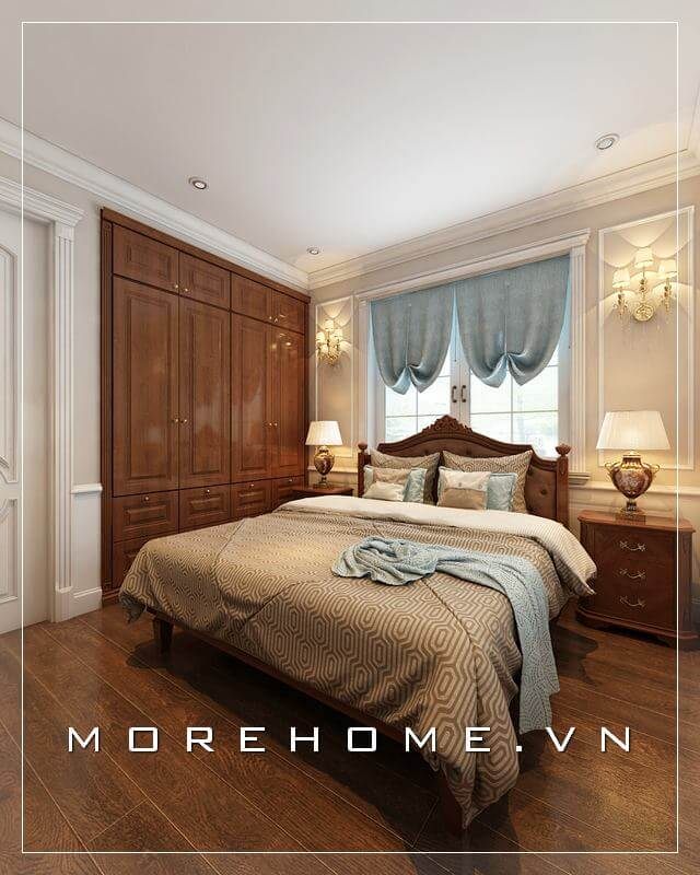Thiết kế phòng ngủ của chung cư theo phong cách tân cổ điển sang trọng, với nội thất gỗ óc chó màu nâu đặc biệt ấn tượng, góp phần tạo nên một không gian nghỉ ngơi êm ái và ấm cúng.