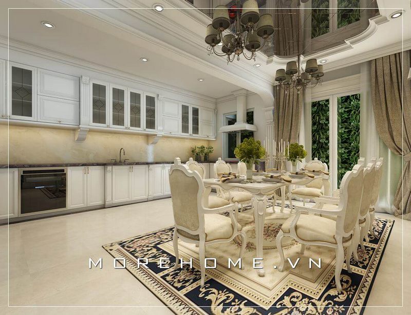 Nội thất phòng bếp ăn biệt thự được thiết kế theo phong cách tân cổ điển sang trọng và đẳng cấp.